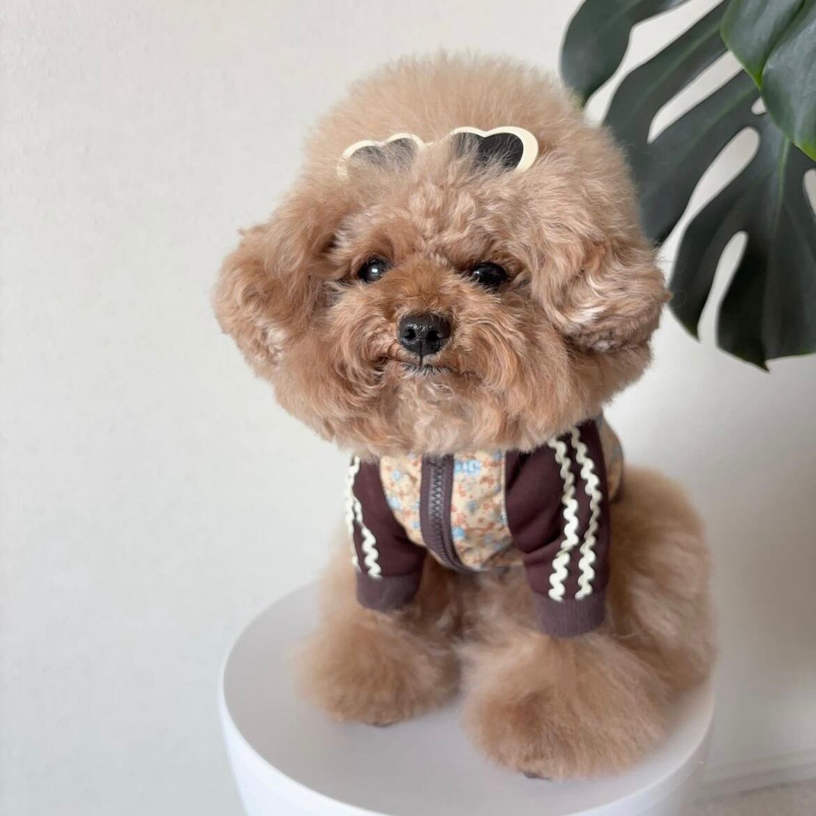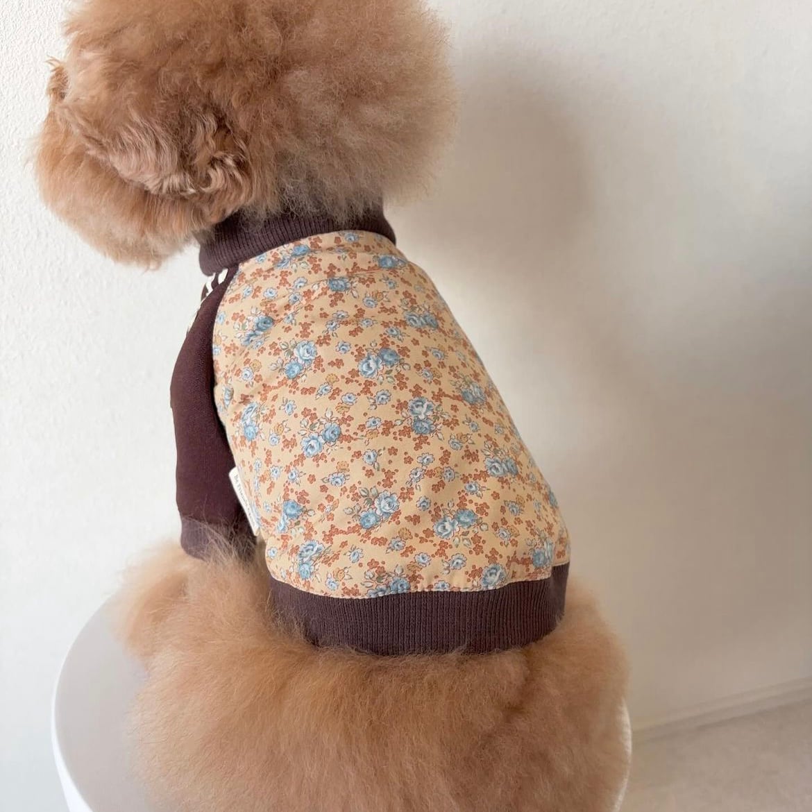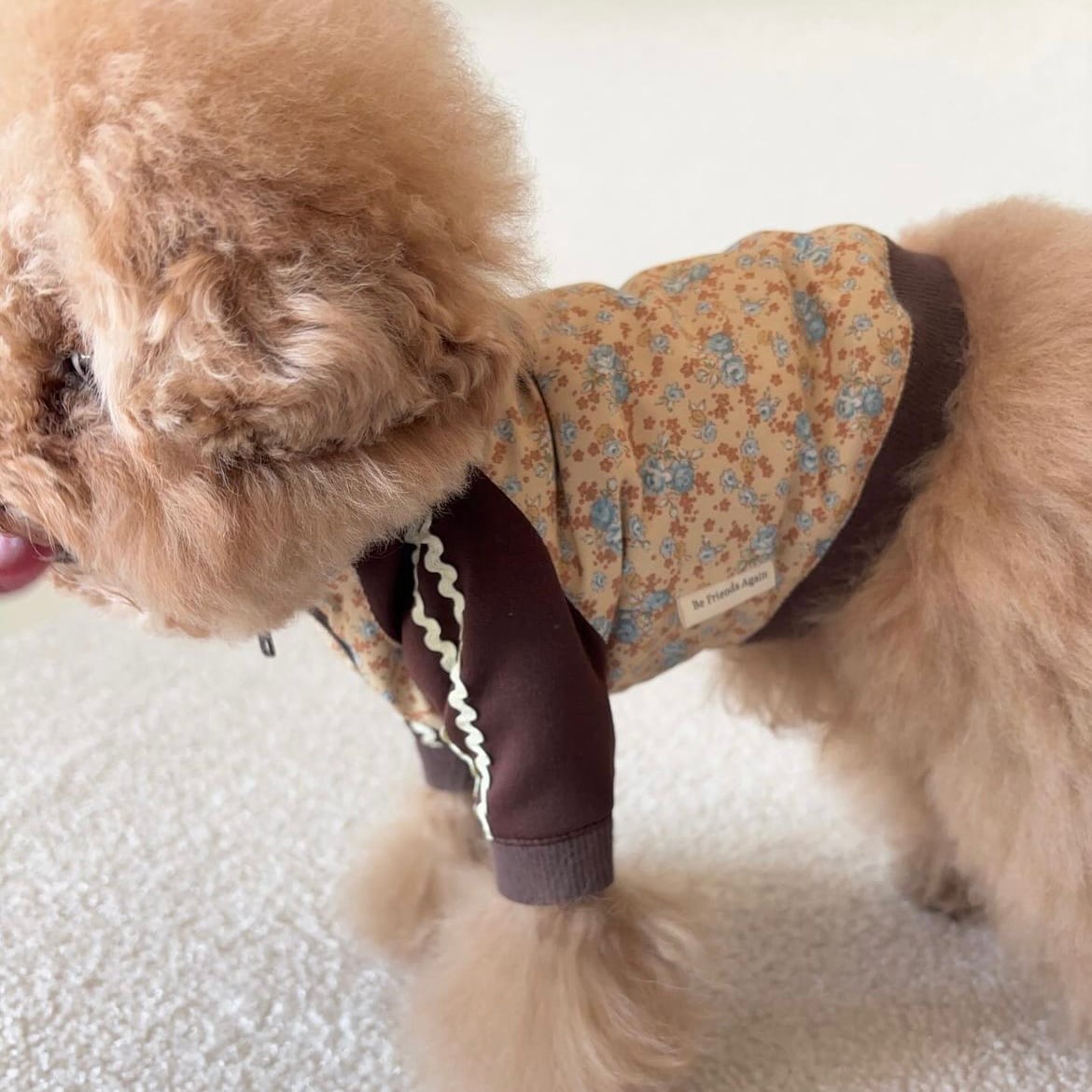 Be Friends Againから、 Flower Jerseyシリーズ第3弾「Honey Flower Jersey」が登場しました! かわいらしい花柄を主役に、 落ち着いた茶色のカラーを組み合わせた、 Be Friends Againにしかないデザインのジャージです。 袖のラインはユニセックスな雰囲気を加える為、 Pale Flower Jerseyと同じく 「うねうねライン」を使用し、ユニセックスな可愛らしさをさらにアップさせました。 ジャージシルエットで、 愛犬が自由に動き回れる快適さも魅力! ドッグランやアクティブなお出かけにもぴったりです。 前開きのファスナー仕様で、簡単に着脱ができますので、 お洋服が苦手なワンちゃんにもおすすめです。 華やかなデザインと、ワンちゃんに優しい快適さを兼ね備えたHoney Flower Jersey。 Be Friends Againのこだわりが詰まったこの新作をぜひお試しください! 【送料】 12,000円以上のご購入で送料が無料となります。 【素材】 ボディ、リブ部分:コットン100% ジャージ部分:ポリエステル100% 【生産】 縫製のプロが国内で一つ一つ手作りいたします。 Be Friends Againのお洋服は全てMade in Japanの高品質でお届けしております。 【納期について】 受注をいただいてからの制作となりますので、 約1~2週間ほどいただきます。 【モデル】 あんずちゃん 犬種:トイプードル 着用サイズ:XS あんずちゃんのお体のサイズ 体重:2.7キロ 首周り:24cm 胴回り(一番太いところ):37cm 足の長さ:12cm 背丈:25cm 【お洋服のサイズ実寸】 XSサイズ 首回り:約27.5cm 着丈:約20cm 胴回り:約40cm 袖丈(脇下から袖口までの長さ):約7cm Sサイズ 首回り:約33cm 着丈:約21.5cm 胴回り:約46.5cm 袖丈(脇下から袖口までの長さ):約10.5cm Mサイズ 首回り:約38cm 着丈:約24.5cm 胴回り:約53cm 袖丈(脇下から袖口までの長さ):約12cm Lサイズ 首回り:約40cm 着丈:約29cm 胴回り:約57cm 袖丈(脇下から袖口までの長さ):約12cm XL 首回り:約42cm 着丈:約31cm 胴回り:約60cm 袖丈(脇下から袖口までの長さ):約12.5cm 足の短いワンちゃんの為に、 袖丈を調整することが可能です。 袖の調整が必要な場合は袖調整オプションをつけていただき、 カート備考で何cm袖を縮めるかご指定ください。 ※一つ一つ手作りをしている為、サイズには数ミリの誤差が生じる可能性がございます。あらかじめご了承くださいませ。 ※サイズにご不安のある方はご試着サービスをご利用くださいませ。